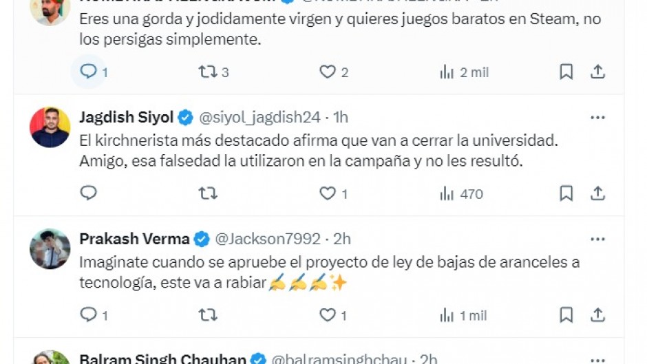 Uno de ellos fue Balram Singh Chauhan, que mostró un llamativo conocimiento de la cuestión universitaria en Argentina, al mismo tiempo que contestaba tuits en varios idiomas. “El kirchnerista mas lucido, dice que van a cerrar la universidad. Flaco, esa mentira la usaron para la campaña y no les fue muy bien”, escribió este miércoles, pocas horas antes que comenzara la marcha.