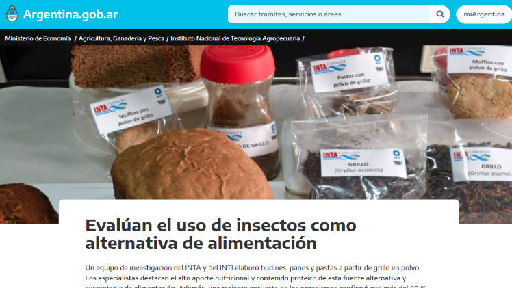 En la Argentina, un equipo de investigación del INTA y del INTI elaboró budines, panes y pastas a partir de grillo en polvo. “En un mundo cada vez más habitado, la producción de alimentos gana protagonismo y plantea nuevos desafíos. Así es que alimentar a 8.000 millones de habitantes requiere de alternativas que se sumen a las ya conocidas. Para esto, las fuentes de proteínas de alta calidad nutricional ocupan un rol transcendental”, sostuvieron desde el INTA.