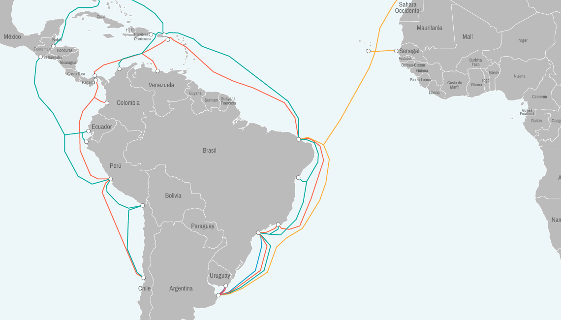 Los cables van siguiendo la costa sudamericana, haciendo pie en varias ciudades del continente (del lado atlántico y pacífico) para llegar a Miami, una de las ciudades con mayor conectividad en la región, y luego cruzar a Europa (por lo general, a la costa portuguesa o española). En este sitio se pueden ver los cables submarinos que llevan Internet a todo el planeta.