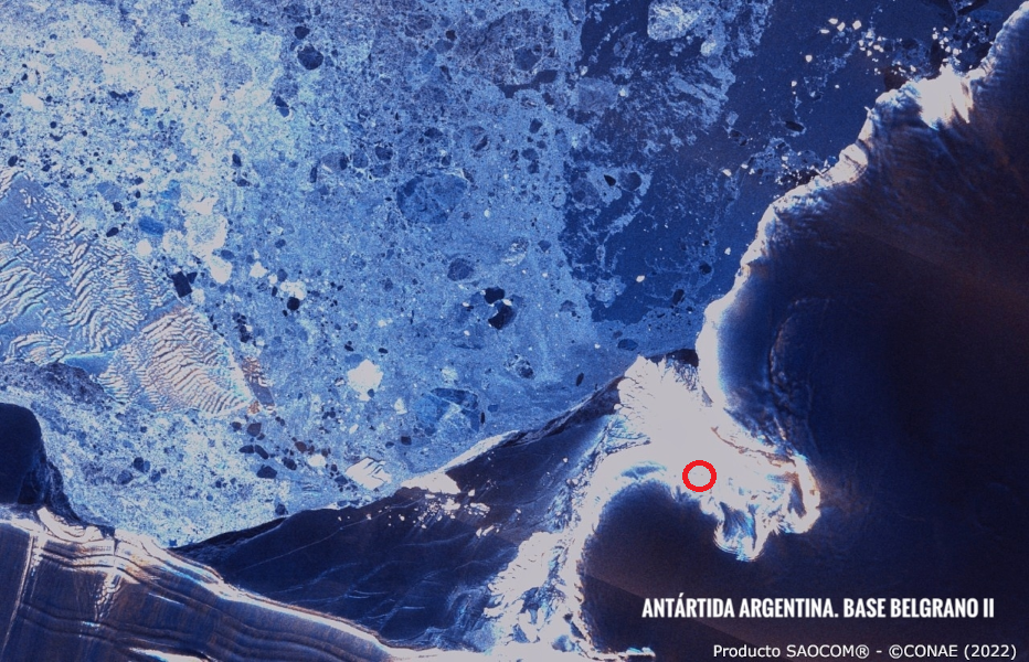 Imagen SAOCOM 1A adquirida el 10 febrero de 2022. Se observa el sector de la Antártida donde se encuentra la Base Belgrano II de la Argentina, fue procesada en falso color y permite identificar en diversos tonos azules claros el campo de hielo marino.