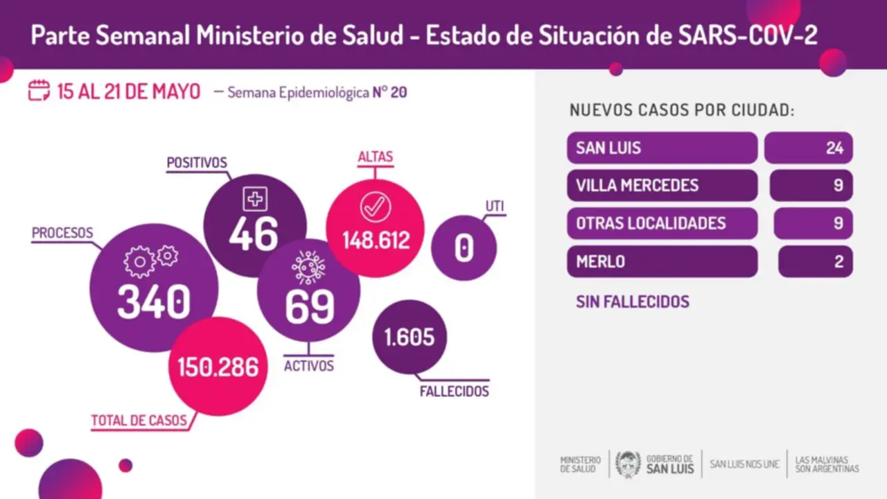 Este martes el Comité de Crisis de la Provincia informó que del 15 al 21 de mayo fueron analizadas un total de 340 muestras, de las cuales 46 dieron positivo para COVID-19, y que no se produjeron muertes por la enfermedad. Con estos nuevos números en San Luis se contabilizan hasta la fecha un total de 150.286 casos desde el inicio de la pandemia.