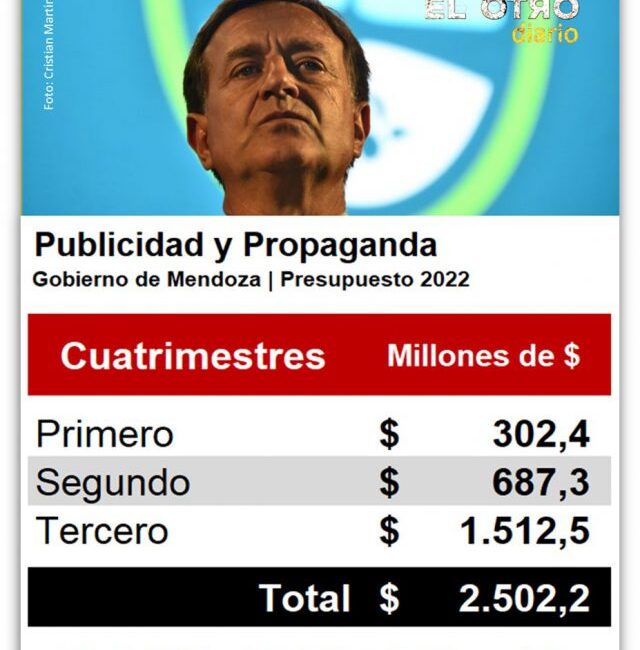 Los informes oficiales de la Contaduría General de la Provincia revelan que, solo durante el año pasado, el gobernador Rodolfo Suarez gastó 2.502 millones de pesos en publicidad y propaganda oficial. Cifra que se queda corta para el análisis real, si se considera que esta rendición de cuentas no incluye las pautas multimillonarias de organismos descentralizados (OSEP, ATM, Juegos y Casinos, IPV, Vialidad, Dirección de Agricultura y Contingencias Climáticas, Fondo para la Transformación y Crecimiento); organismos autárquicos (Irrigación, Asesoría de Gobierno, Defensoría de las Personas con Discapacidad); entes reguladores (EPRE, EPAS); entre otras dependencias del Estado en las que Cambia Mendoza conserva una decisiva influencia.