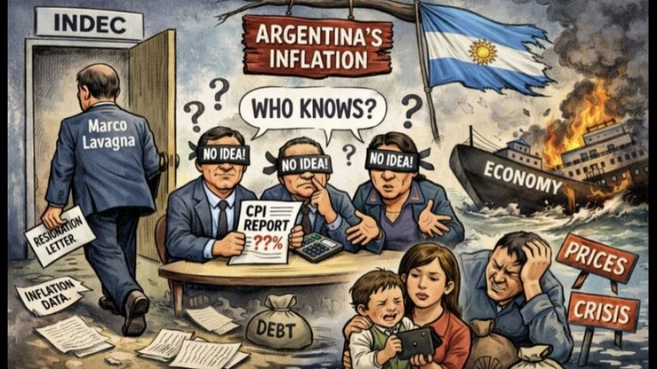 Un barco en llamas con la palabra “Economy”, economistas con los ojos vendados frente a un informe de inflación lleno de signos de pregunta, Marco Lavagna que abandona el Indec y una familia muerta de hambre, mirando la escena con angustia. La cruda caricatura fue publicada por Steve Hanke, el padre de la dolarización que prometió Milei y no cumplió.
