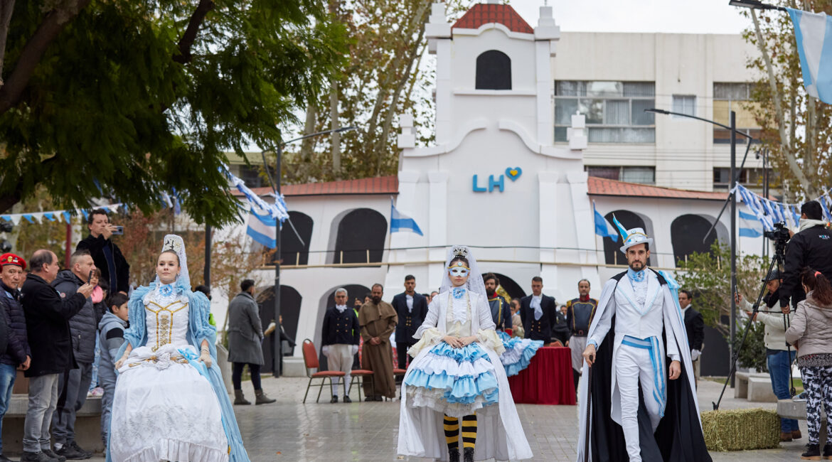 Nunca antes una plaza pública había lucido tan patriótica como este 25 de mayo, “vestida para la época”, el escenario central de los festejos fue un verdadero viaje a 1810, que inició con el acto protocolar y el ingreso por el portal del Cabildo de una bandera argentina de 15 metros, llevada por “damas y caballeros” vestidos con atuendos tradicionales, y con una mujer, “vestida de Patria”, en celeste y blanco, cargando en sus brazos la insignia nacional Era el comienzo de los festejos patrios en la plaza Marcos Burgos donde las familias y los vecinos eran los invitados de honor.