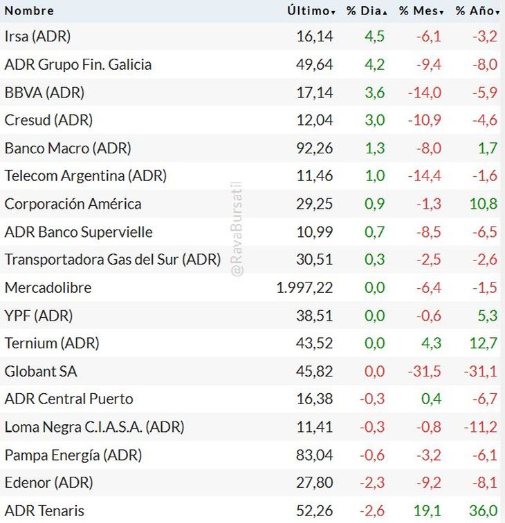 En Wall Street, los ADRs de empresas argentinas cerraron la jornada con mayoría de ascensos. Los más importantes los protagonizaron los papeles de IRSA (+4,5%); Galicia (+4,2%); y BBVA (+3,6%).