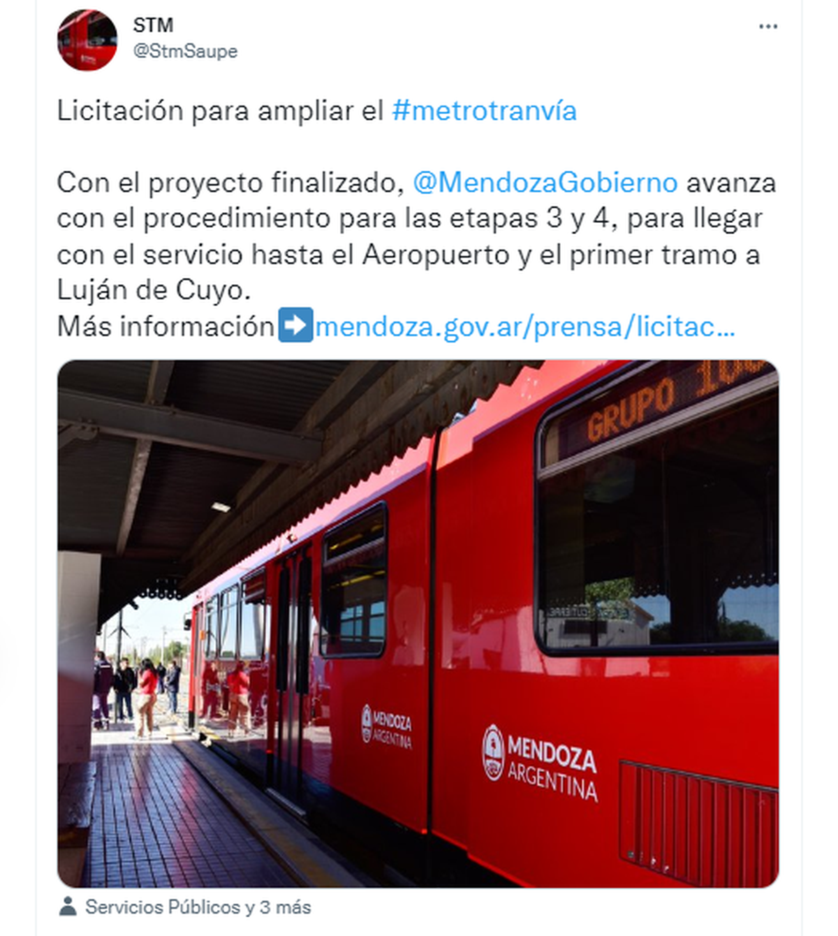 Luego de la dura batalla que debió dar para que la oposición le avalara el endeudamiento para extender la traza del Metrotranvía, este martes el Gobierno abrió la licitación para la obra obra que llevará ese medio de transporte hasta el Aeropuerto El Plumerillo hacia el norte, y el primer tramo para que llegue a Luján en el Sur.