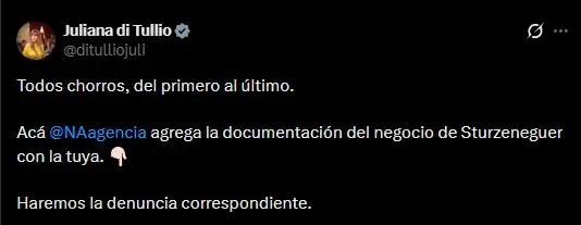 La senadora Juliana di Tullio, referente del interbloque de Unión por la Patria, adelantó que legisladores del espacio presentarán una denuncia tras la difusión de la contratación. A través de sus redes sociales, la legisladora cuestionó con dureza el vínculo entre el ministro y la entidad adjudicataria y afirmó que impulsarán acciones formales.