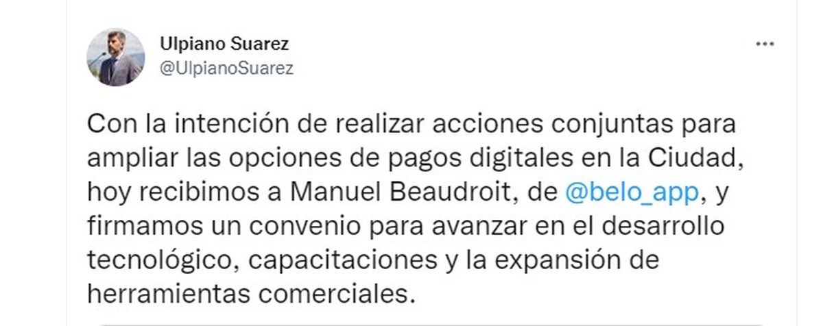 En ese sentido, el intendente de Mendoza, Ulpiano Suarez; y Manuel Beaudroit, presidente de Belo Cash, empresa propietaria de la aplicación; firmaron el pasado viernes un convenio marco con la idea de que en un futuro el municipio expanda las opciones de los medios de pagos de los comercios, así como también se lleven a cabo diferentes capacitaciones de la temática.